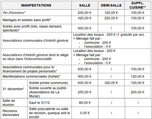 Pour la salle polyvalente : Chèque de caution de 1500€ libellé à l’ordre du trésor public et établi par un murazien, déposé en garantie des dommages éventuels (vol, détérioration, non respect de la propreté des lieux et du matériel, non respect des clauses du contrat, etc.).