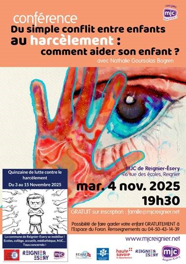 Dans le cadre de la quinzaine de lutte contre le harcèlement, la MJC de Reignier organise ce mardi 4 novembre à 19h30 une conférence autour du harcèlement : du simple conflit au harcèlement : comment aider son enfant?
