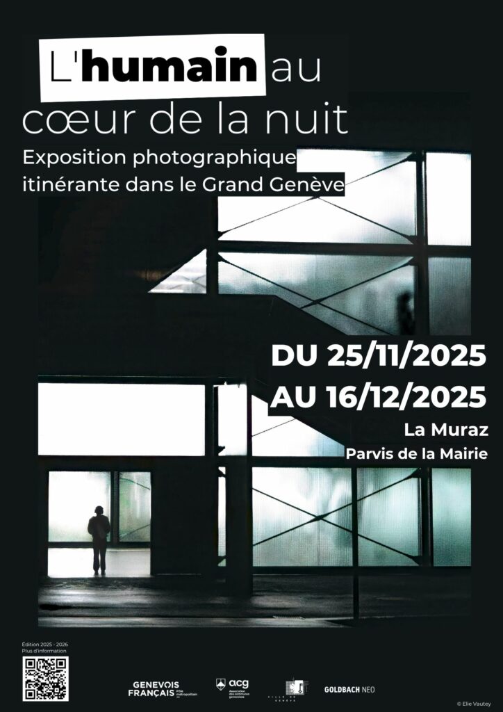 Du 25/11/2025 au 16/12/2025 venez découvrir cette exposition transfrontalière qui met en lumière… la nuit. Une série de photographies saisissantes capturant les scènes de vie nocturne dans le Grand Genève : travailleurs de l’ombre, flâneurs du soir, instants partagés ou solitudes lumineuses.