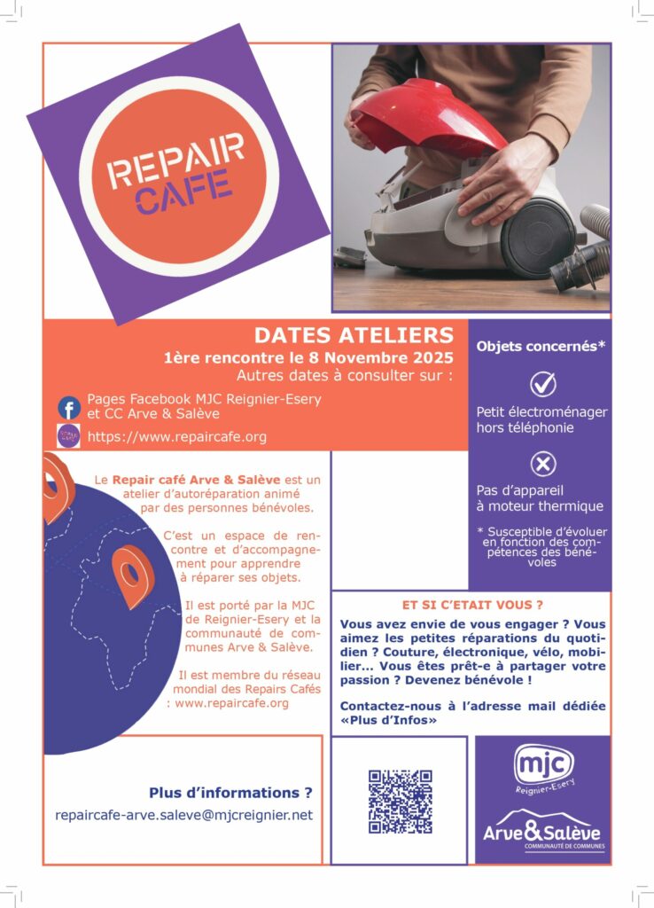 Ensuite, les dates sont à consulter sur Facebook MJC Reignier-Esery ou CC Arve et Salève, sur le site repaircafe.org et avec le QR code présent ci-dessous; par mail à repaircafe-arve.saleve@mjcreignier.net
