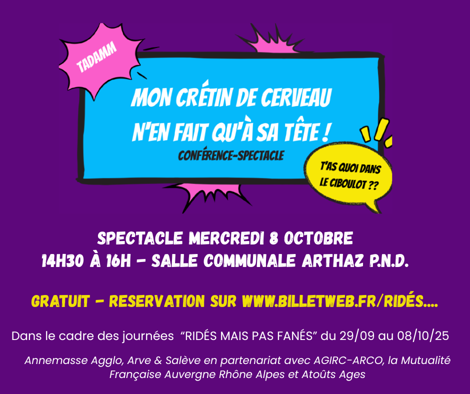 Ridés mais pas fanés Publié le 6 octobre 2025 | Par Mairie de La Muraz Conférence-spectacle le mercredi 8 octobre de 14h30 à 16h, à la salle communale d’ARTHAZ-PONT-NOTRE-DAME. Spectacle gratuit.